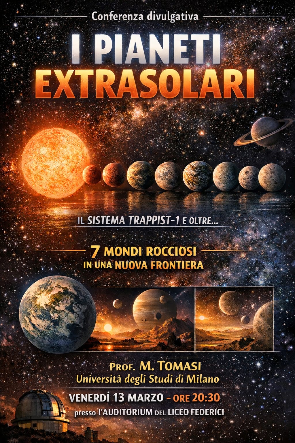 All'Auditorium del Liceo Federici di Trescore, รจ in programma una conferenza divulgativa tenuta dal prof. Tomasi dell'Universitร degli studi di Milano, sulla scoperta di nuovi pianeti extrasolari.