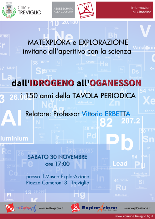 Sabato 30 Novembre alle ore 17.00 presso il Museo ExplorAzione si terrà un aperitivo con la Scienza alla scoperta della tavola periodica per festeggiare i suoi 150 anni. Relatore Professor Vittorio Erbetta.