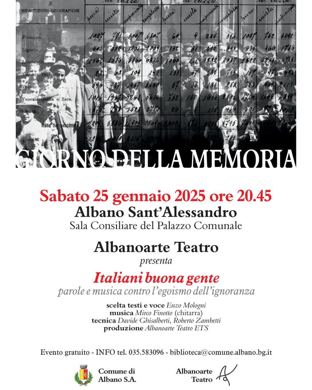 In occasione della Giornata della Memoria 2025, il Comune di Albano Sant'Alessandro vi invita ad assistere allo spettacolo "Italiani buona gente".