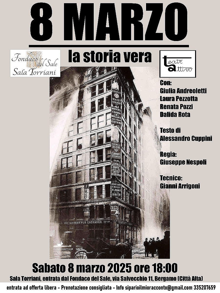 Se si domanda a cento persone perché fu scelta e cosa ricorda la data dell’8 marzo, Giornata della donna, ottanta volte su cento si ottiene la risposta: «Non lo so»; diciannove volte la risposta è: «Certo che lo so: l’incendio in quella fabbrica di Chicago. O era di New York?» Qualcuna si ricorda anche la data: «Era l’8 marzo 1908.» Una su cento sa la storia vera.