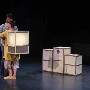 I due attori in scena sono circondati da sfere luminose e oggetti sferici in