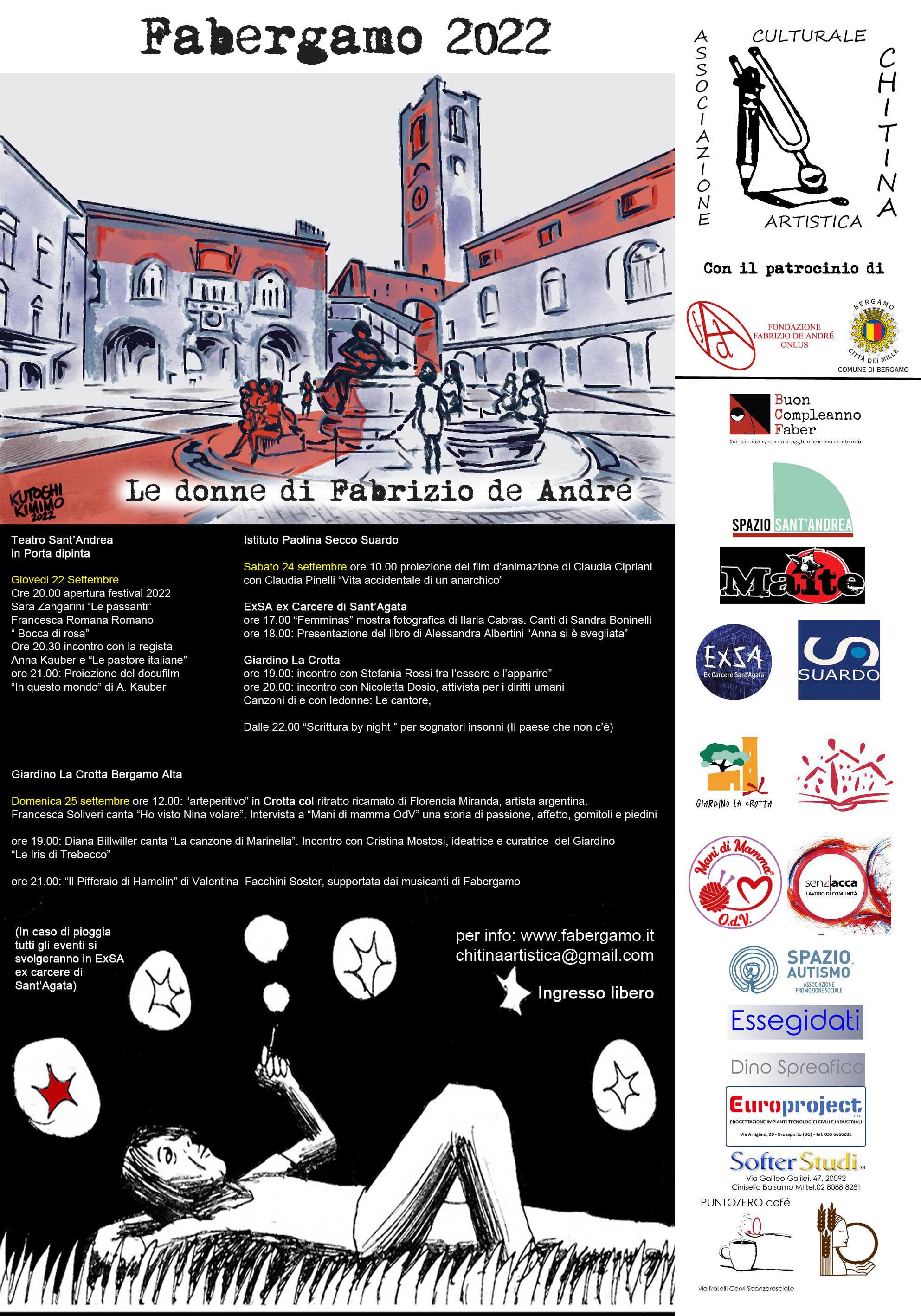 L'Associazione culturale Chitina artistica, Maite e i giovani del collettivo abitante ExSA ex Carcere di Sant’Agata organizza la quarta edizione del festival Fabergamo sui temi cantati nelle canzoni di Fabrizio De André.