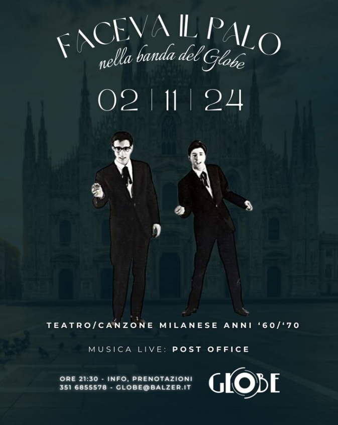 Il teatro/canzone milanese tipico degli anni '60 e '70 sarà ospite del Globe con la band dei Post Office. Ad accompagnare, piatti tipici della cucina milanese.