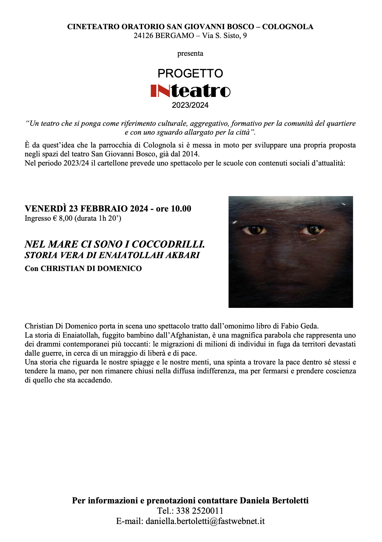 A Colognola viene presentato lo spettacolo "Nel mare ci sono i coccodrilli" di Christian di Domenico, tratto dall'omonimo libro. Uno spettacolo che parla delle migrazioni di milioni di individui in fuga dalla propria patria in cerca di libertà e pace.