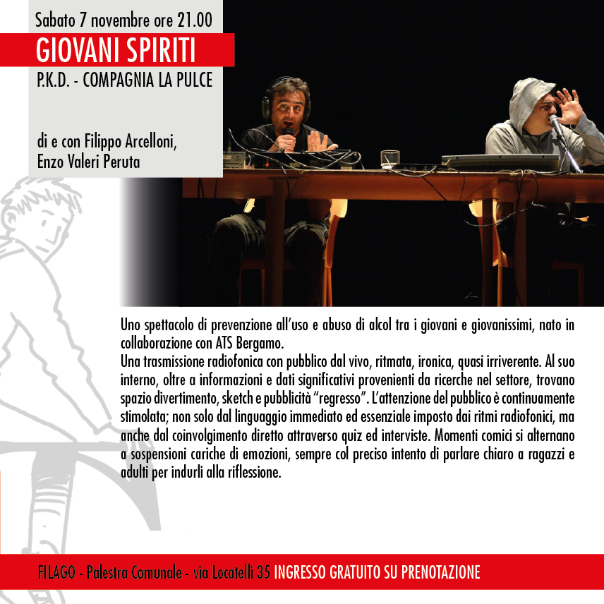 Uno spettacolo di prevenzione all’uso e abuso di alcol tra i giovani e giovanissimi, nato in collaborazione con ATS Bergamo. Una trasmissione radiofonica con pubblico dal vivo, ritmata, ironica, quasi irriverente. Al suo interno, oltre a informazioni e dati significativi provenienti da ricerche nel settore, trovano spazio divertimento, sketch e pubblicità “regresso”. L’attenzione del pubblico è continuamente stimolata; non solo dal linguaggio immediato ed essenziale imposto dai ritmi radiofonici, ma anche dal coinvolgimento diretto attraverso quiz ed interviste. Momenti comici si alternano a sospensioni cariche di emozioni, sempre col preciso intento di parlare chiaro a ragazzi e adulti per indurli alla riflessione.