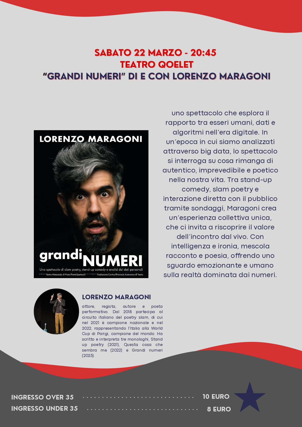Continuano gli appuntamenti della rassegna PrendiNota, al Qoelet di Redona! In scena la stand up poetry secondo Lorenzo Maragoni: poesia e statistica a teatro