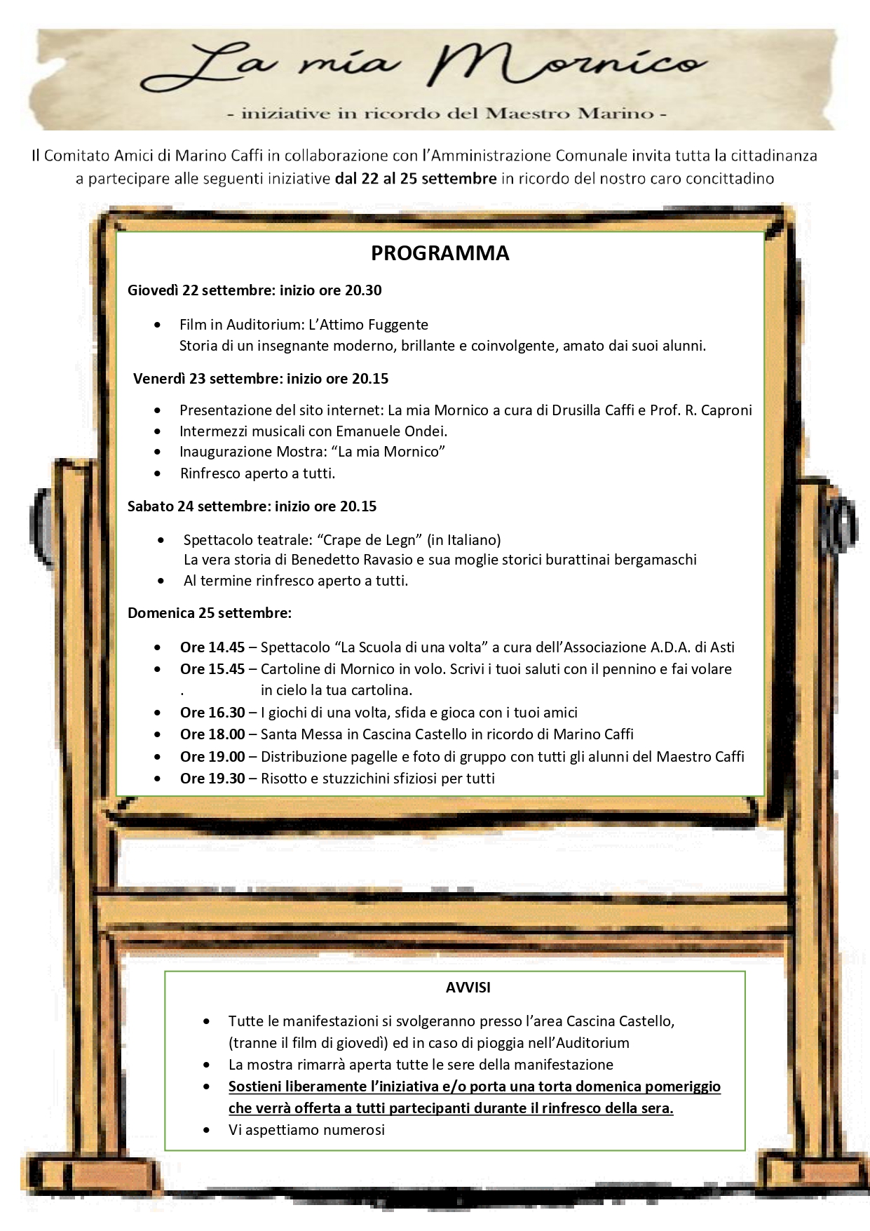 Il comitato gli "amici di Marino Caffi", in collaborazione con l'amministrazione comunale, organizza una tre giorni ricchi di iniziative, in memoria del Maestro Marino.