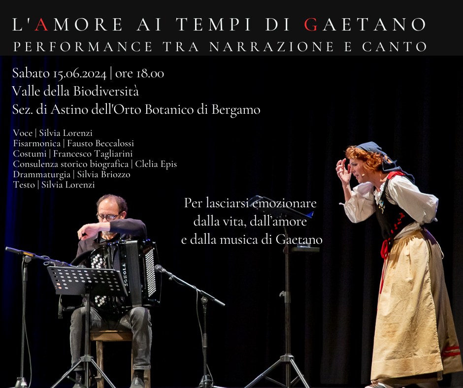 “L’amore ai tempi di Gaetano” è una performance di narrazione e canto, organizzata dall'associazione Cinema e Arte con la collaborazione di Proloco Bergamo, Comune di Bergamo e Orto Botanico di Bergamo Lorenzo Rota, che vede protagonista il Soprano Silvia Lorenzi, accompagnata dal Maestro Fausto Beccalossi alla fisarmonica.