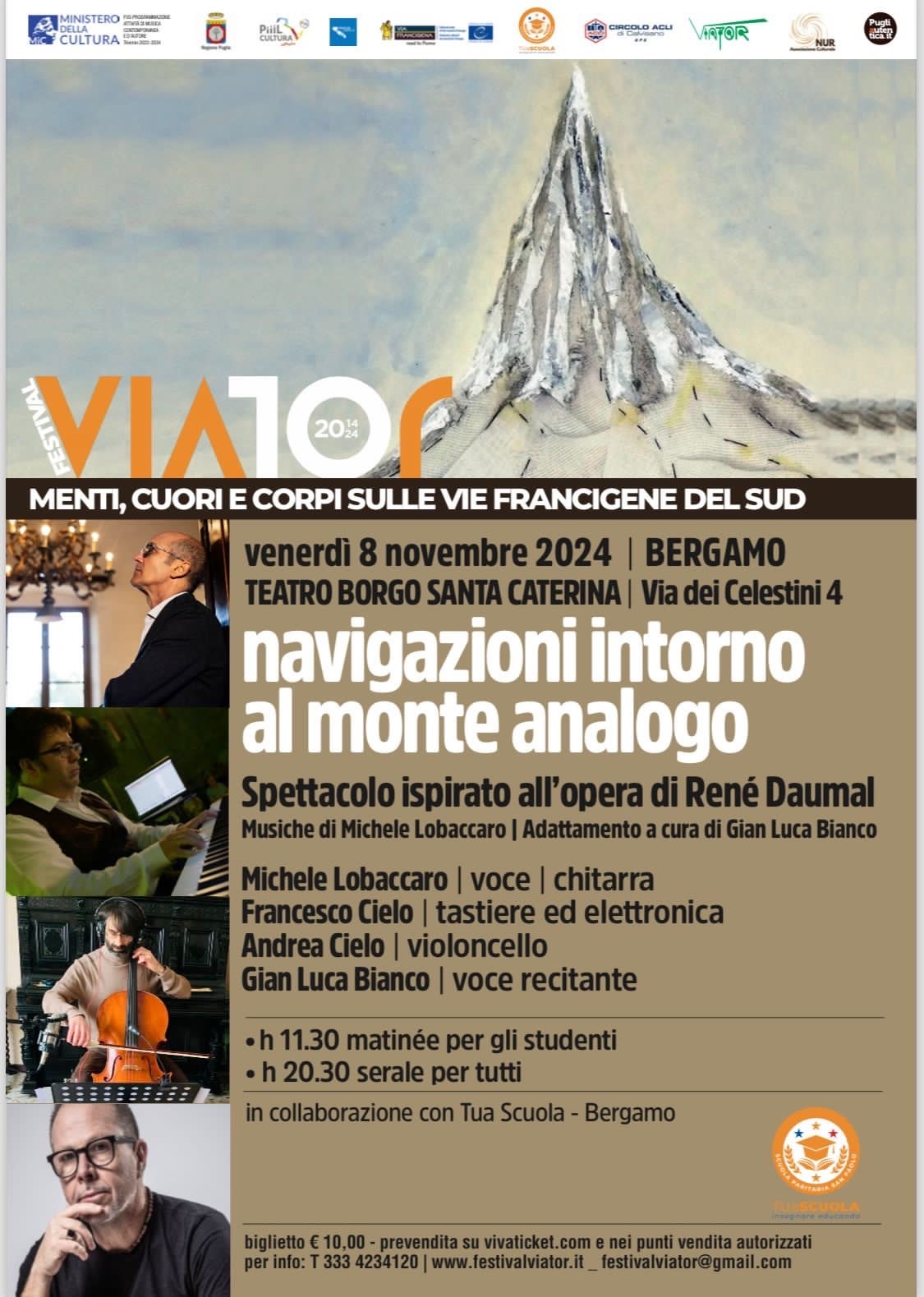 Un preziosissimo appuntamento della rassegna eventi TuaSCUOLA: lo spettacolo dal carattere emotivo, intimo ed avvolgente condurrà, tra musica e racconto, in un viaggio mistico verso la Montagna Sacra. Di M. Lobaccaro e G. Bianco.