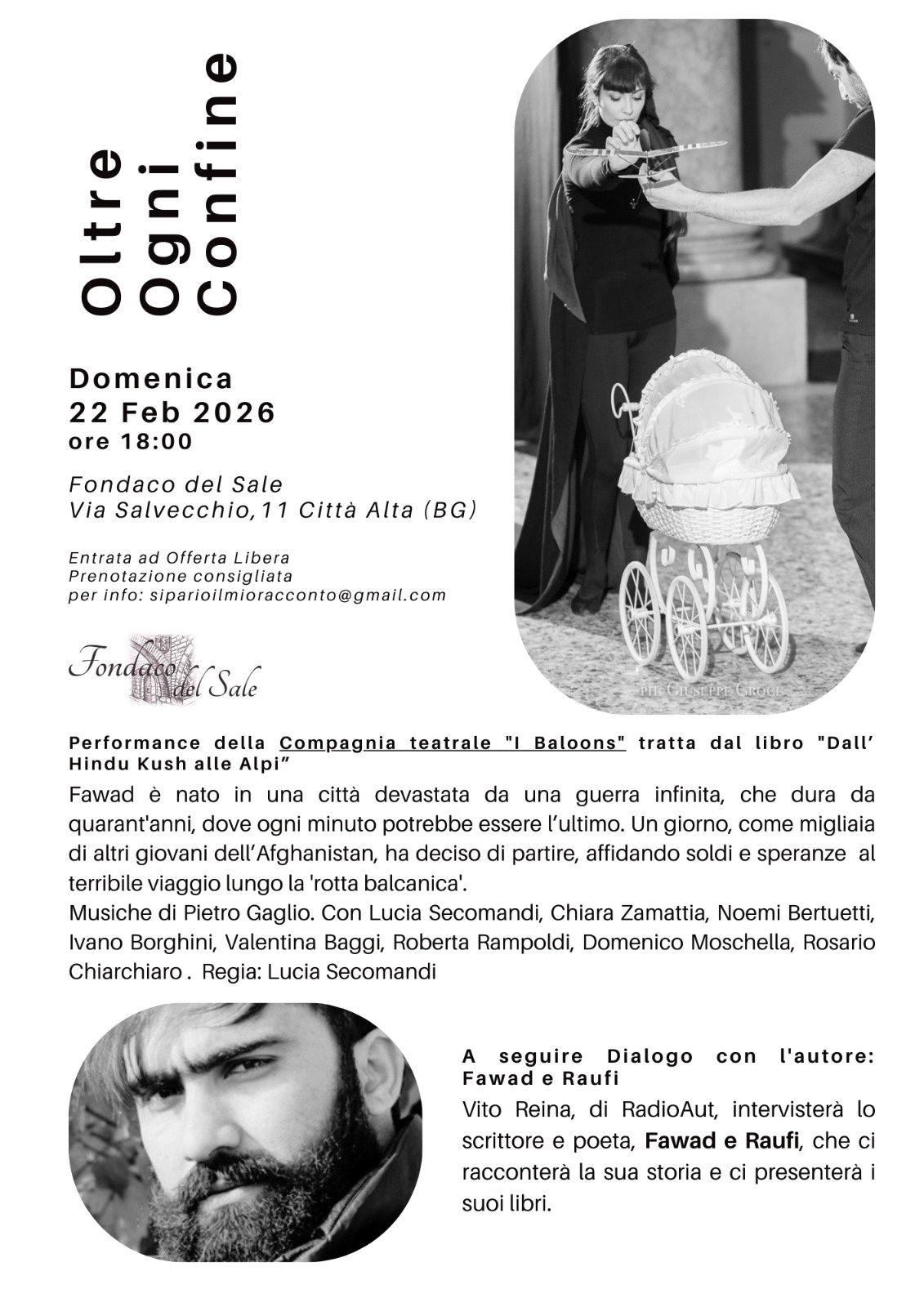 Una performance della Compagnia teatrale I Baloons tratta dal libro «Dall’ Hindu Kush alle Alpi»: Fawad, nato in una città devastata da una guerra infinita, ha deciso di partire, affidando soldi e speranze al terribile viaggio lungo la rotta balcanica.