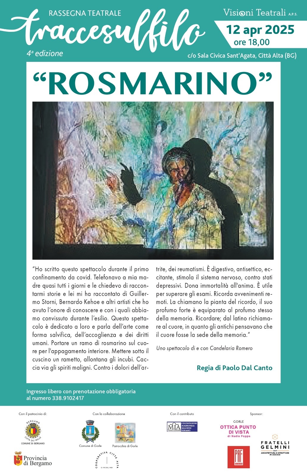 Lo spettacolo "Rosmarino" di e con Candelaria Romero, regia Palo Dal Canto, vi aspetta all'interno della rassegna teatrale «Tracce sul filo» di Visioni teatrali, presso la Sala Civica Sant'Agata (Città Alta), sabato 12 aprile alle 18.