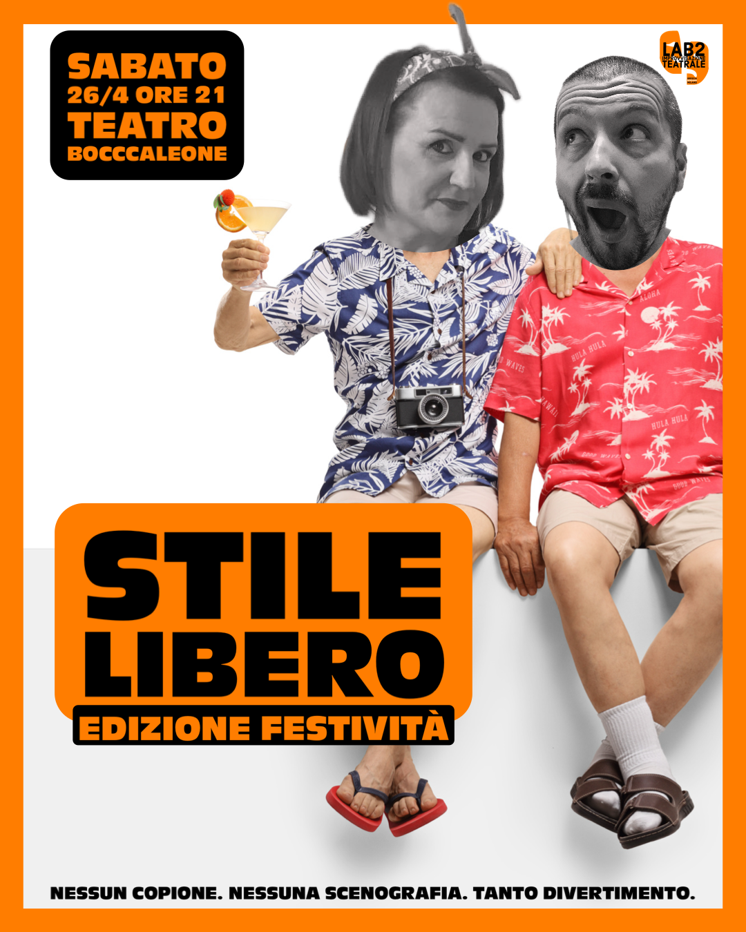 Stile libero è improvvisazione teatrale allo stato puro! Un attore e un’attrice, gli input dal pubblico e un vortice di personaggi, storie, situazioni mai viste prime. Che vi faranno morire dal ridere.