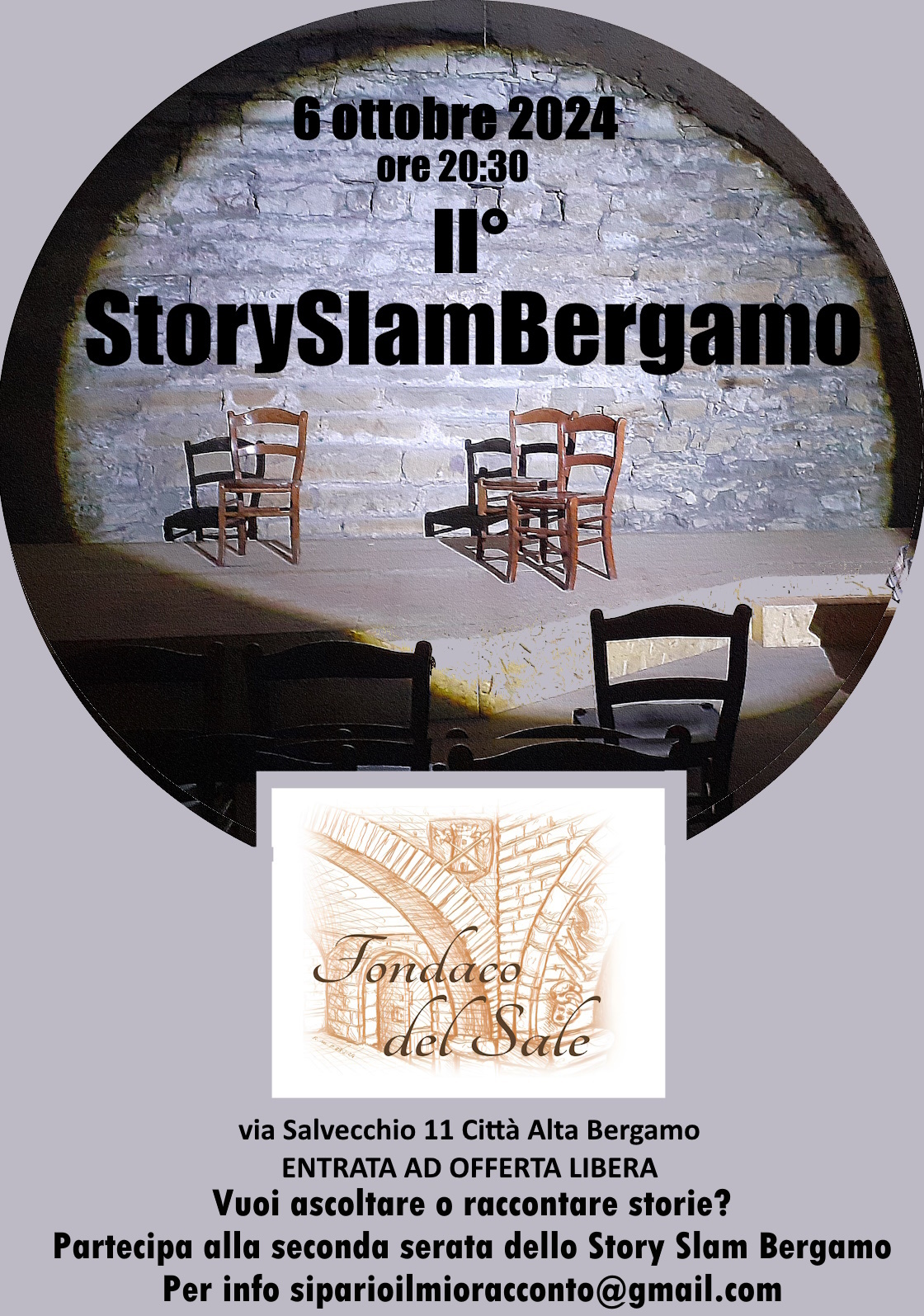 Lo Story Slam è un campionato di storie vere. Ci si incontra al Fondaco del Sale in via Salvecchio 11 e calcando un palco incastonato in una suggestiva sala nascosta nella Bergamo medievale ciascuno è invitato a raccontare una storia o ad ascoltare le storie degli altri. Ogni partecipante avrà 5 minuti per raccontare la sua storia sul palco. Terminate le storie il pubblico sceglierà, con una votazione, quale è stata la più interessante o accattivante.
