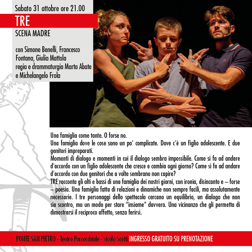 TRE racconta gli alti e bassi di una famiglia dei nostri giorni, con ironia, disincanto e – forse – poesia. Una famiglia fatta di relazioni e dinamiche non sempre facili, ma assolutamente ecessarie. I tre personaggi dello spettacolo cercano un equilibrio, un dialogo che non sia scontro, ma un modo per stare “insieme” davvero. Una vicinanza che gli permetta di dimostrarsi il reciproco affetto, senza ferirsi.