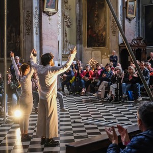 Spazio Circo realizza per Le Vie del Sacro una performance inedita in cui suoni, luci e movimenti acrobatici si fondono con gli spazi suggestivi del cortile della Domus Magna, antica sede della Congregazione della Misericordia Maggiore.