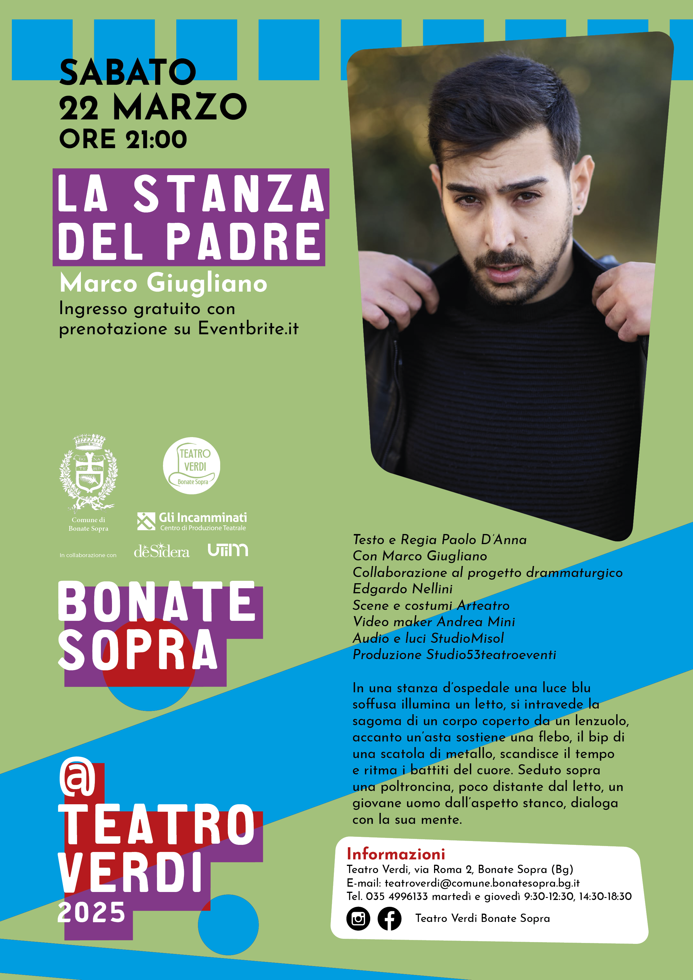 Prosegue la nuova stagione promossa dal Comune di Bonate Sopra, diretta dal teatro De Gli incamminati in collaborazione con deSidera Teatro e Utim: in occasione della Festa del papà, uno spettacolo con Marco Giugliano.