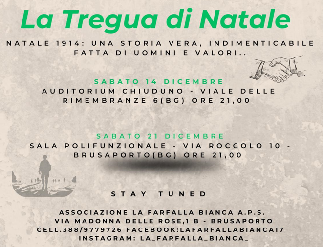 L'Associazione Teatrale La Farfalla Bianca AP presenta una storia vera che risale al Natale 1914: nonostante non fosse stata annunciata nessuna tregua, migliaia di soldati si fermarono durante la guerra sui rispettivi fronti.
