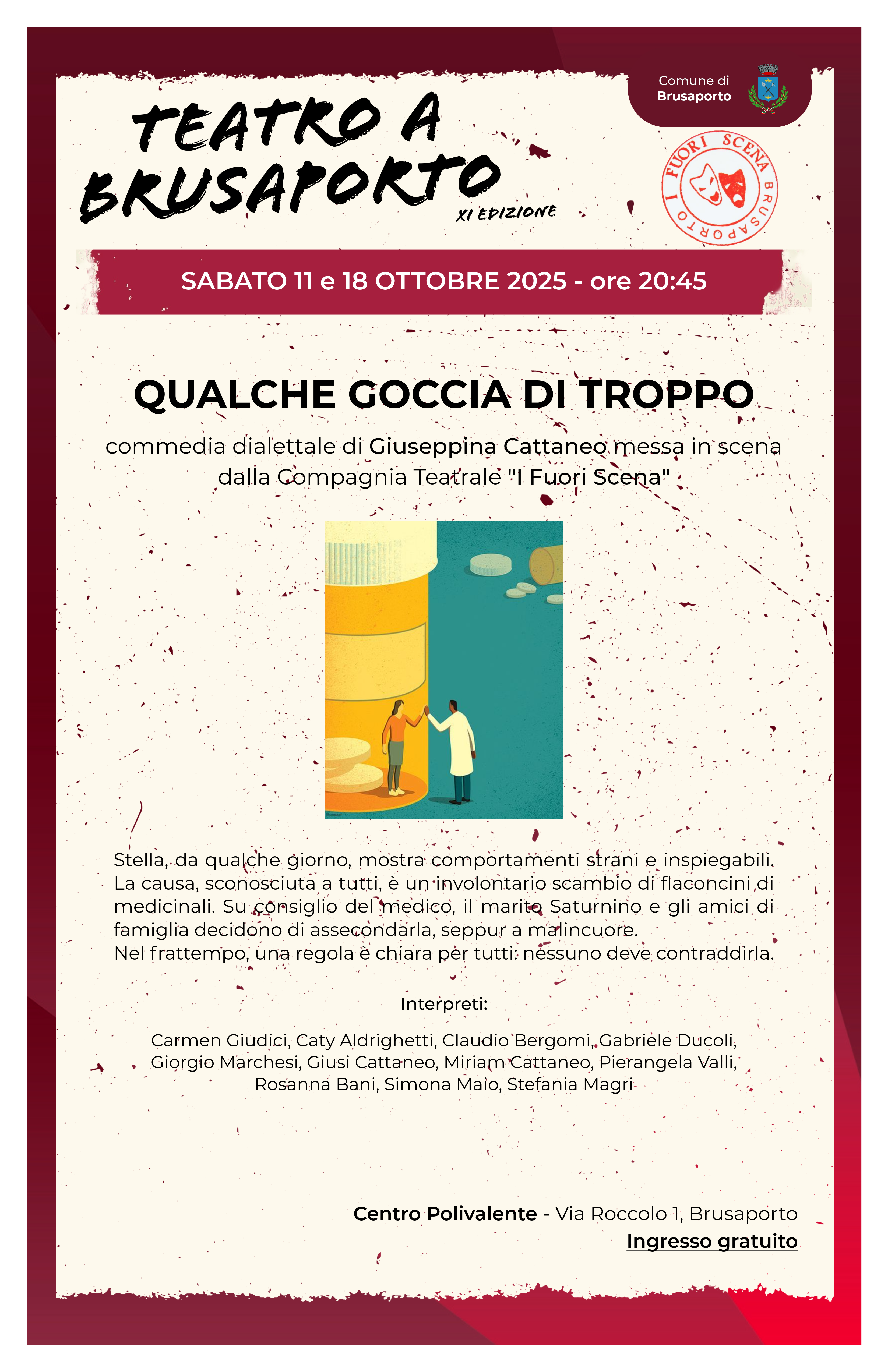 Terzo appuntamento dell’undicesima edizione della rassegna teatrale Teatro a Brusaporto organizzata dall’Amministrazione comunale. I Fuori scena portano lo spettacolo “Qualche goccia di troppo” di Giuseppina Cattaneo.