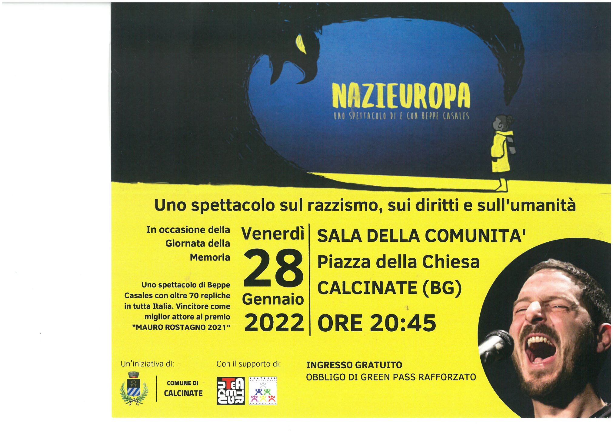 In occasione della Giornata della Memoria 2022, la Sala della Comunità di Calcinate propone "Nazieuropa: uno spettacolo di e con Beppe Casales", un monologo sul razzismo, sui diritti e sull'umanità.