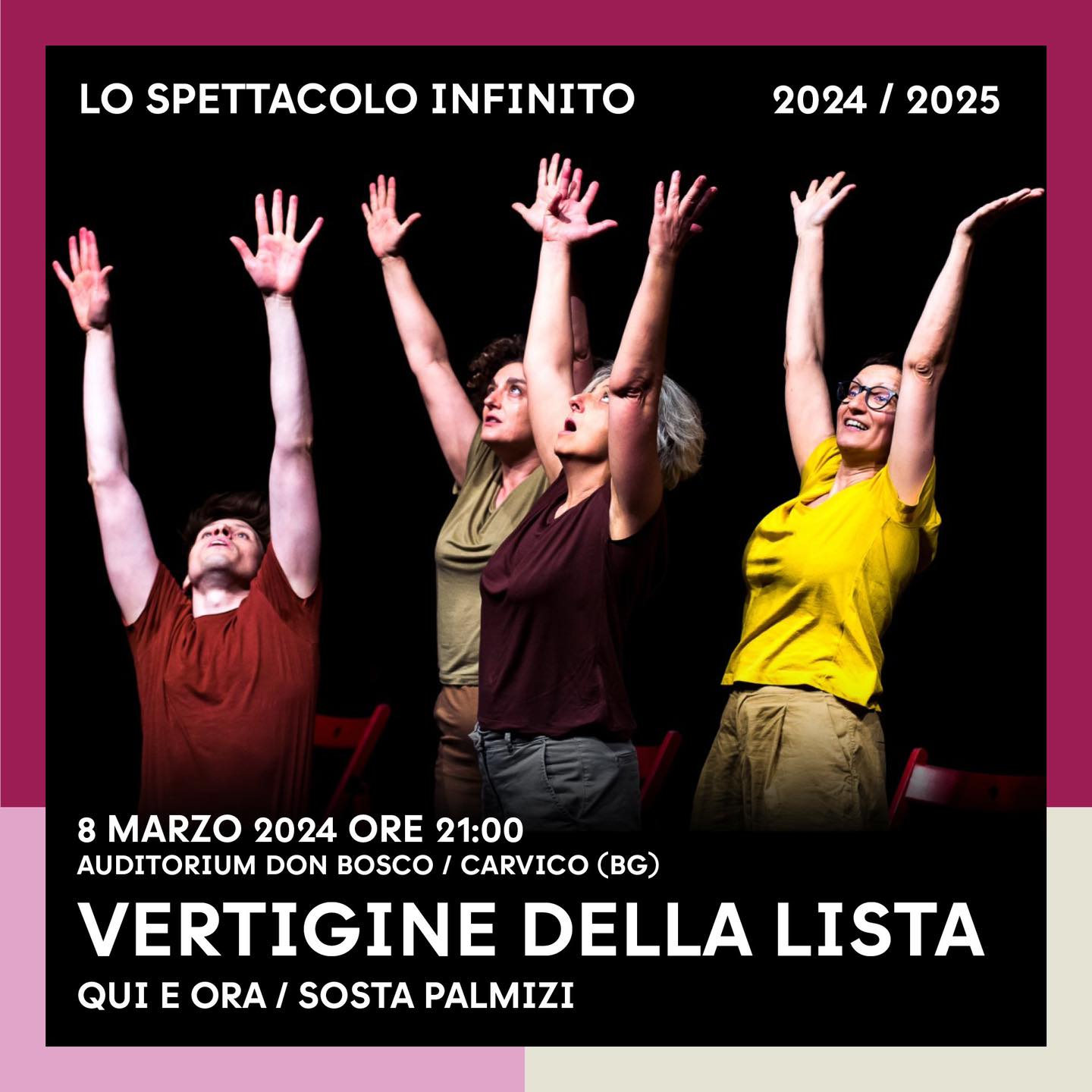 All'interno della rassegna "Lo spettacolo infinito" della compagnia Qui e Ora Residenza Teatrale va in scena con uno spettacolo che ha l'obiettivo di leggere il contemporaneo attraverso la fisicitร e la gioia che provoca la danza.