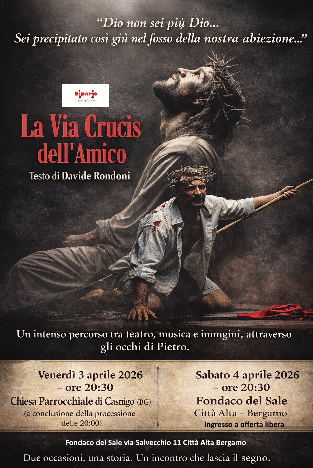 A Casnigo, un itinerario spirituale immersivo basato sul testo di Davide Rondoni. Nel cuore della Settimana Santa 2026, “Sipario – Il mio racconto” presenta “La Via Crucis dell’Amico”, un’opera che trasforma la tradizionale pratica devozionale in un intenso percorso spirituale e poetico. Il testo, commissionato originariamente da un Vescovo al poeta Davide Rondoni, abbandona la cronaca per dare voce all’apostolo Pietro: l’amico che ha amato, dubitato e tradito.