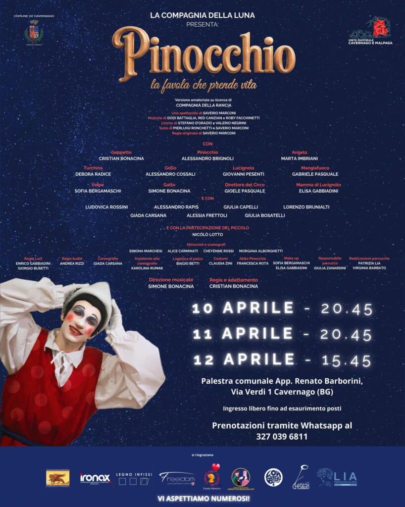 L'appuntamento รจ fissato per le 15.45 presso la Palestra comunale App. Renato Barborini in Via Verdi 1 a Cavernago dove la Compagnia della Luna porterร in scena l'ultimo atto di Pinocchio la favola che prende vita.