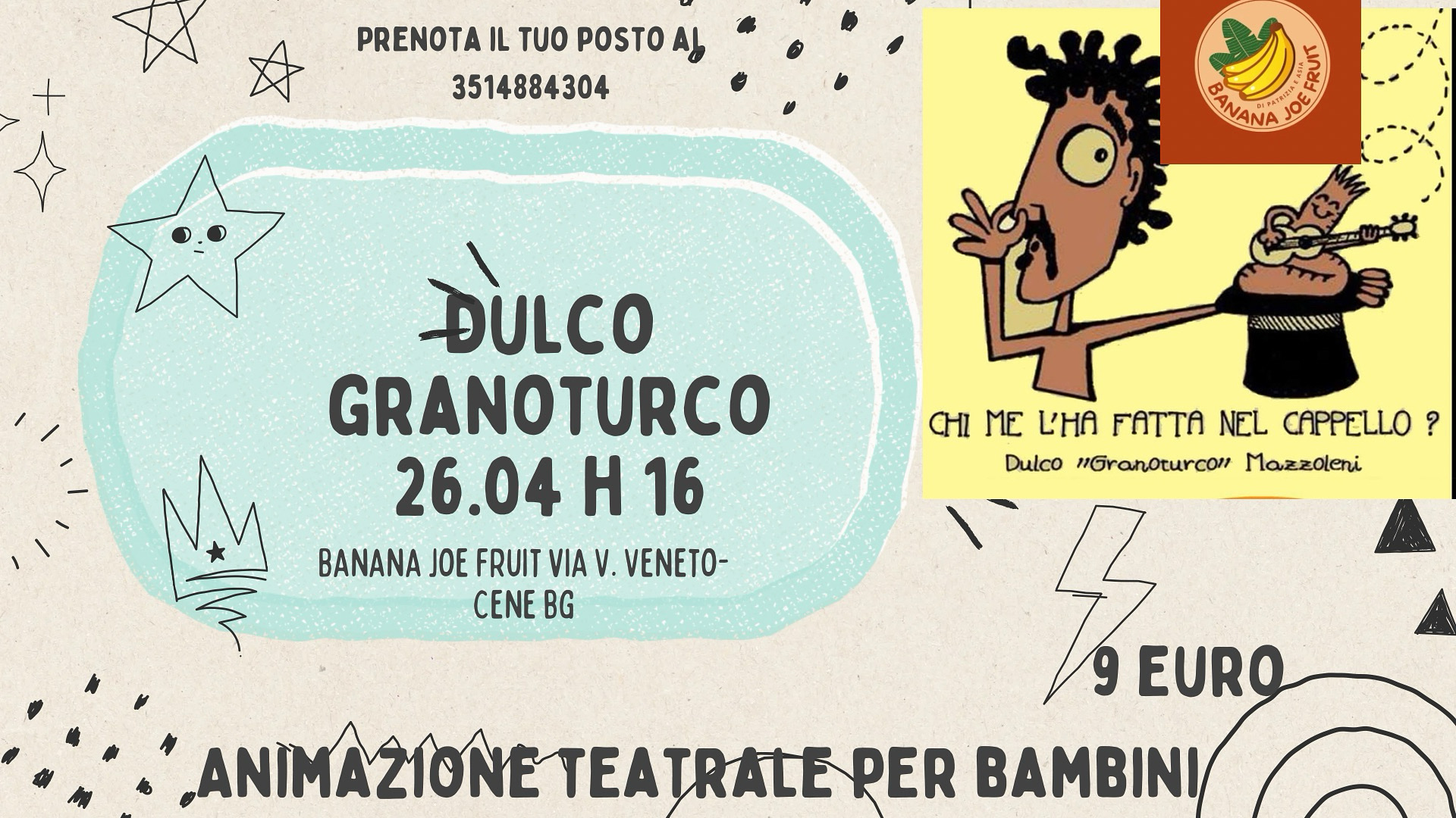 Uno spettacolo teatrale per bambini. Dulco Granoturco è un cantastorie strampalato, attivo da venticinque anni, che compare con un timido strumento: la Chitarra Scimitarra.