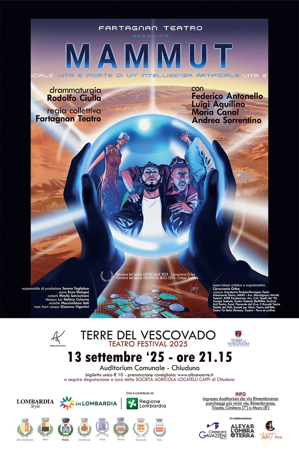 Per «Terre del Vescovado Teatro Festival 2025», la compagnia Fartagnan Teatro porta in scena Mammut, ovvero vita e morte di un’intelligenza artificiale, una sorprendente commedia distopica che unisce ironia pungente, comicità.