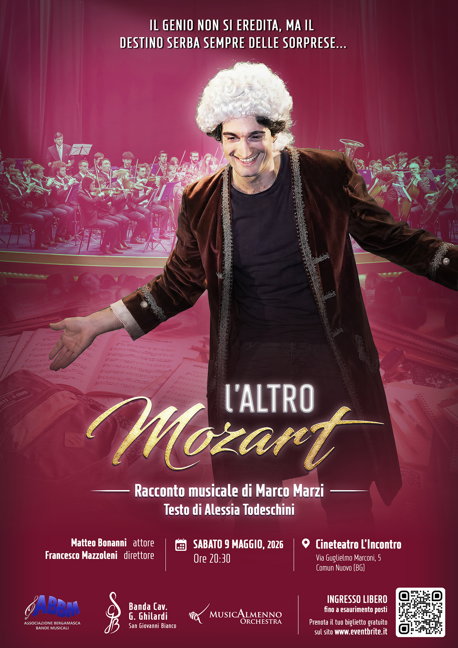 LโOrchestra MusicAlmenno e il Corpo musicale Cav. G. Ghilardi, con la travolgente interpretazione di Matteo Bonanni, danno vita ad unโazione scenica dalla comicitร brillante e irriverente, in cui musicisti e attore dialogano sulle note del compositore per eccellenza โ Wolfgang Amadeus Mozart โ riproposte in chiave leggera e frizzante: uno spettacolo per tutte le etร , dove il mix tra musica e teatro si dimostra piรน che mai esplosivo e coinvolgente.
