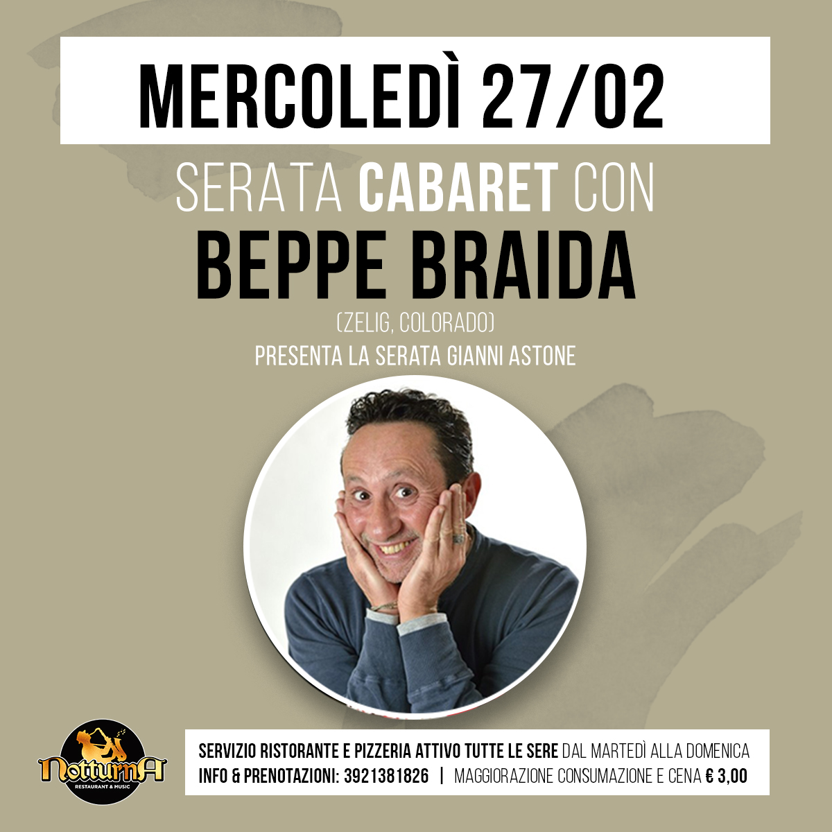 Direttamente dai palchi di Zelig e Colorado, mercoledì 27 febbraio il Notturna ha il piacere di ospitare un grandissimo comico: Beppe Braida.