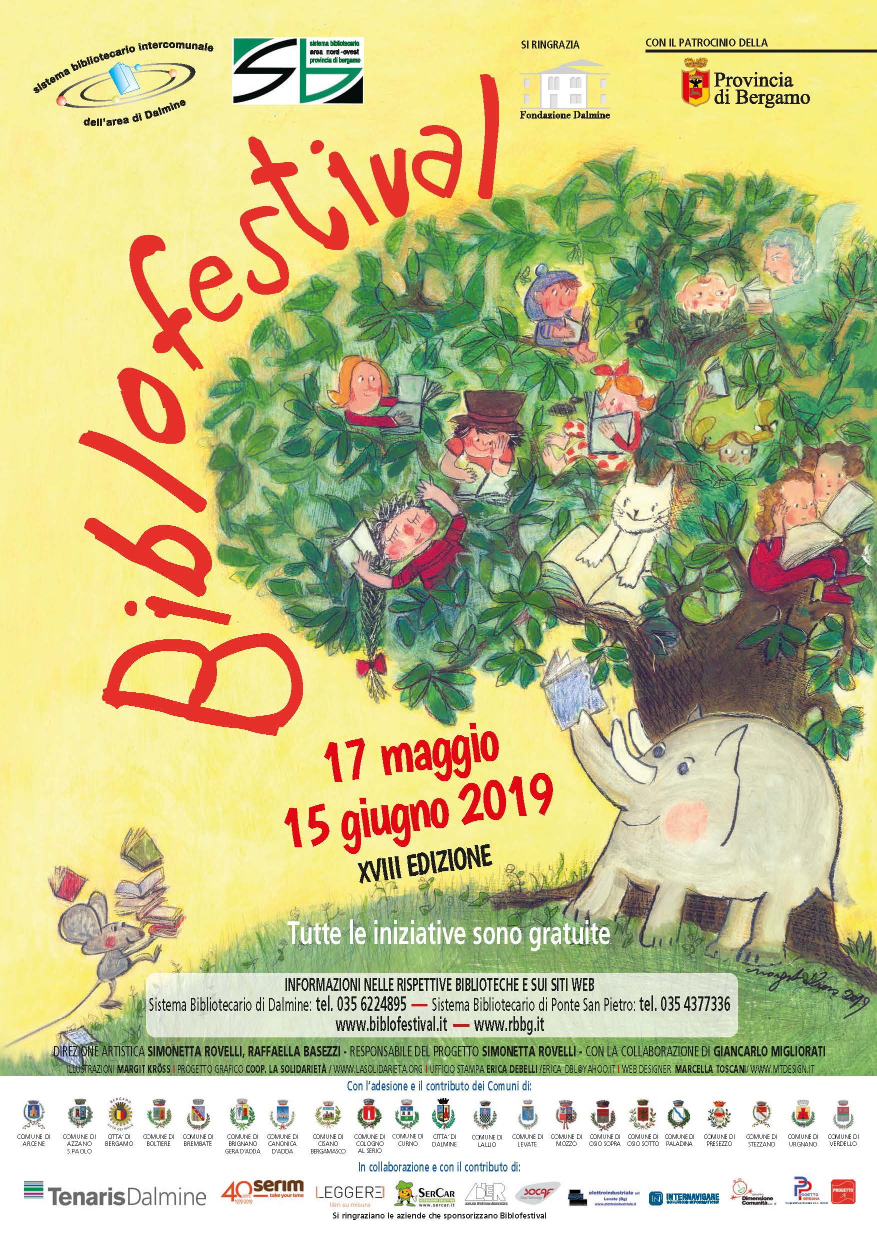 Biblofestival è l'atteso appuntamento per bambini e famiglie che animerà, fino al 15 giugno, strade, piazze, parchi, teatri di diversi paesi della provincia bergamasca e che quest'anno farà tappa anche alla Biblioteca di Bergamo. Oltre a laboratori e giochi, tanti spettacoli di giocoleria, clowneria, teatro di strada, storie e racconti da ascoltare, incontri con autori e illustratori per bambini. Per divertirsi, meravigliarsi e continuare a sognare. Il festival è organizzato e promosso dal Sistema Bibliotecario di Dalmine e dell'Area Nord/Ovest della provincia di Bergamo con la direzione artistica di Simonetta Rovelli e Raffaella Basezzi e la collaborazione di Giancarlo Migliorati.
