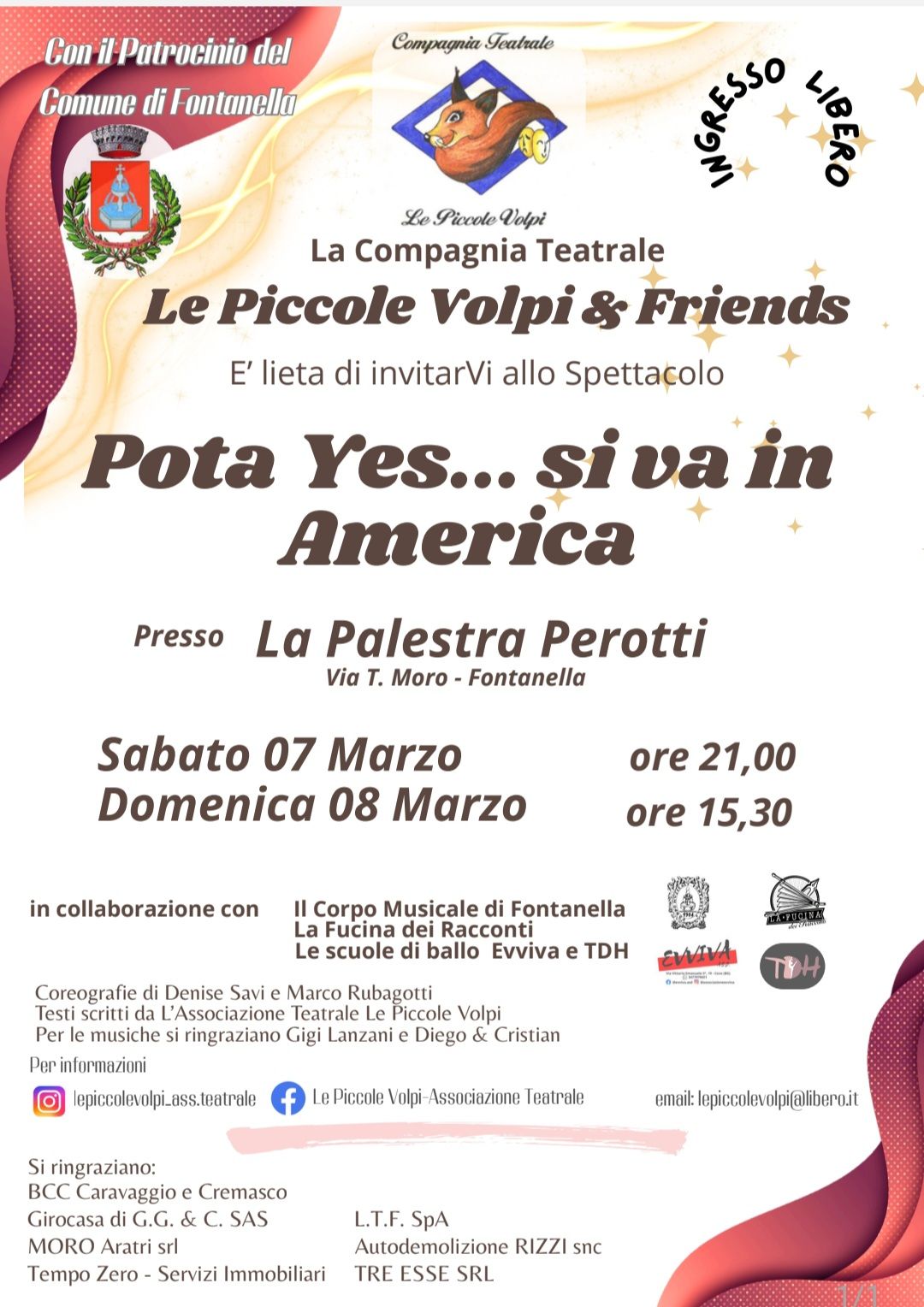 La Compagnia Teatrale Le Piccole Volpi & Friends, con il patrocinio del Comune di Fontanella, presenta con entusiasmo lo spettacolo intitolato ยซPota Yes... si va in Americaยป. L'evento, a ingresso libero, promette unโesperienza coinvolgente grazie alla collaborazione di diverse realtร locali come il Corpo Musicale di Fontanella, La Fucina dei Racconti e le scuole di ballo Evviva e TDH.