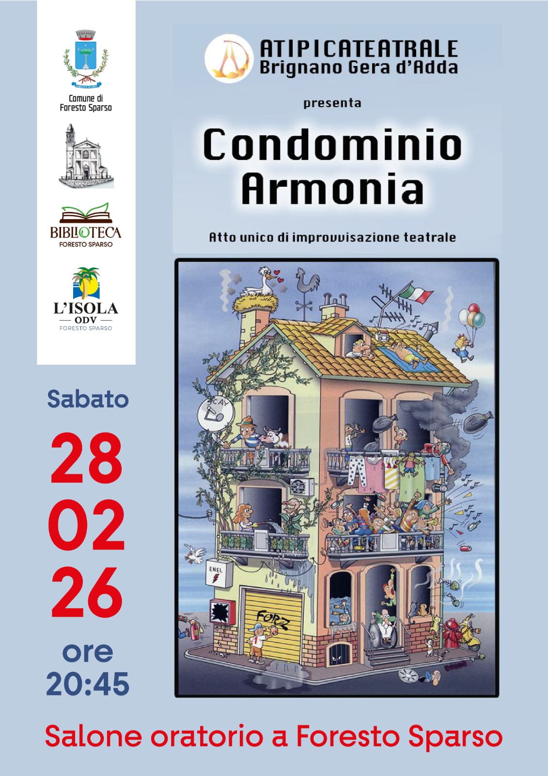 Il gruppo teatrale Atipicateatrale di Brignano Gera d’Adda presenta "Condominio Armonia", uno spettacolo in atto unico di improvvisazione teatrale.