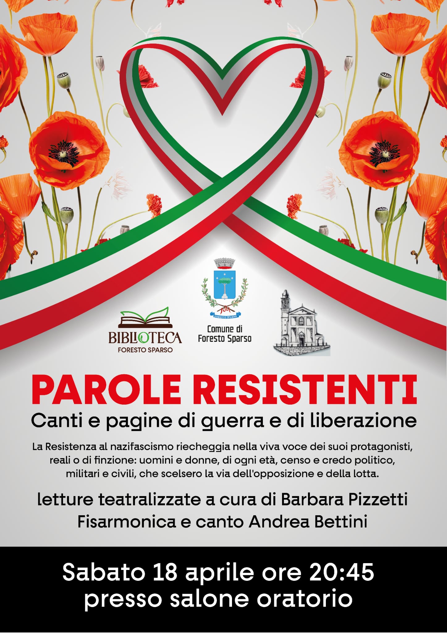 Sabato 18 aprile, alle 20,45, si terrà lo spettacolo "Parole Resistenti. Canti e pagine di guerra e di liberazione", presso il salone dell'Oratorio di Foresto Sparso. La resistenza al nazifascismo riecheggia nella viva voce dei suoi protagonisti, reali o di finzione: uomini e donne, di ogni età, censo e credo politico, militari e civili, che scelsero la via dell'opposizione e della lotta.
