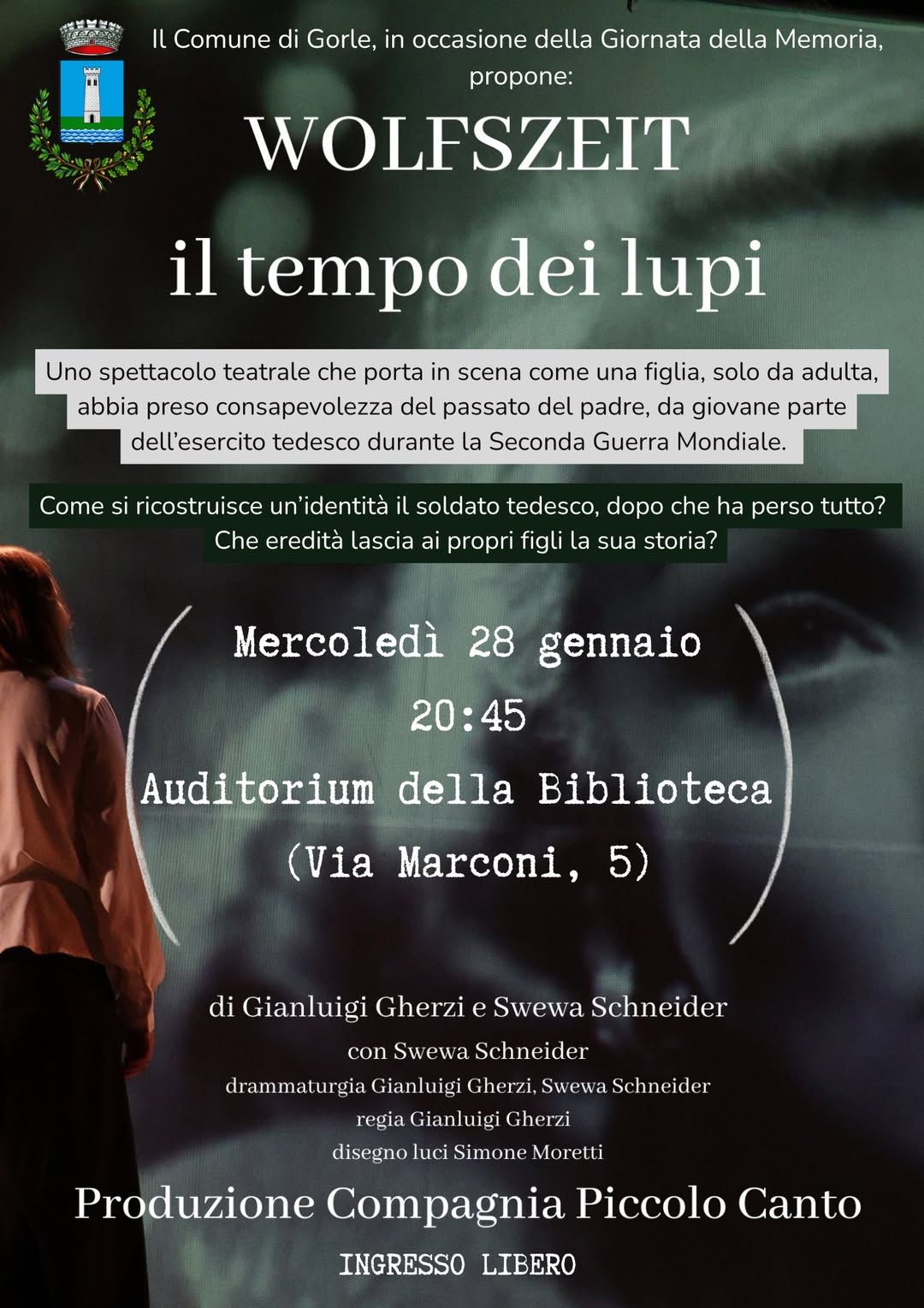 Il Comune di Gorle, in occasione della Giornata della Memoria, mercoledì 28 gennaio alle 20:45 propone lo spettacolo “Wolfszeit. Il tempo dei lupi”.