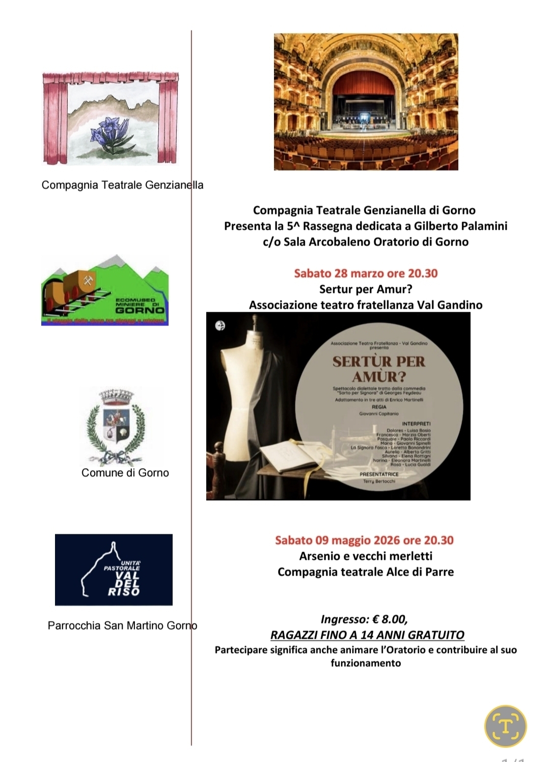 Per la 5a rassegna teatrale dedicata a Gilberto Palamini, la Compagnia teatrale Genzianella di Gorno presenta la commedia dialettale presso la Sala Arcobaleno dell'Oratorio di Gorno.