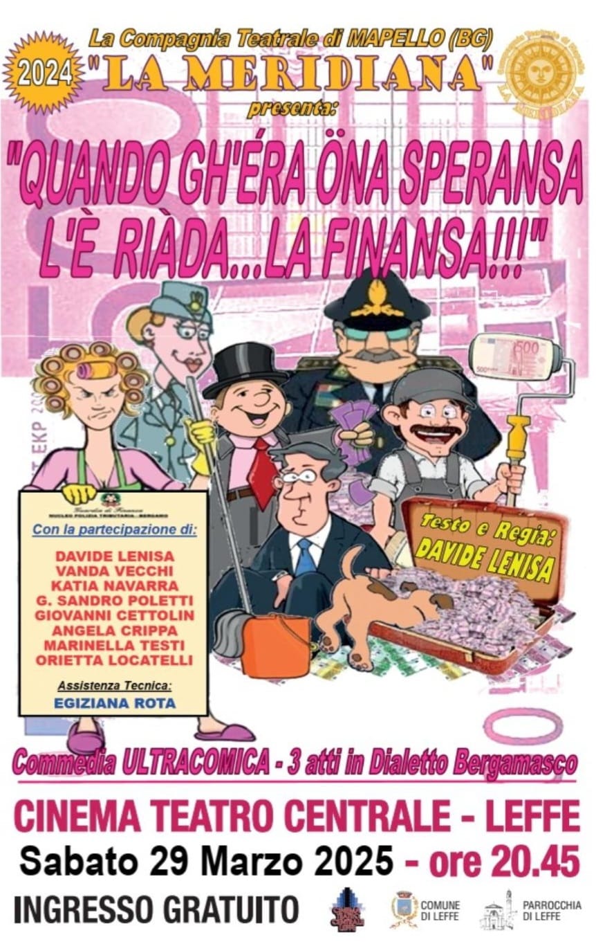 Sabato 29 marzo alle 20.45 il Cinema Centrale di Leffe, in collaborazione con Comune e Parrocchia di San Michele, propone una serata dedicata al teatro dialettale, con la volontà di divertire, raccontando vicende quotidiane quanto paradossali. È il caso dello spettacolo proposto dalla Compagnia Teatrale “la Meridiana” di Mapello, che porta in scena con oltre vent’anni di esperienza una commedia “ultracomica” in tre atti con testo e regia di Davide Lenisa.