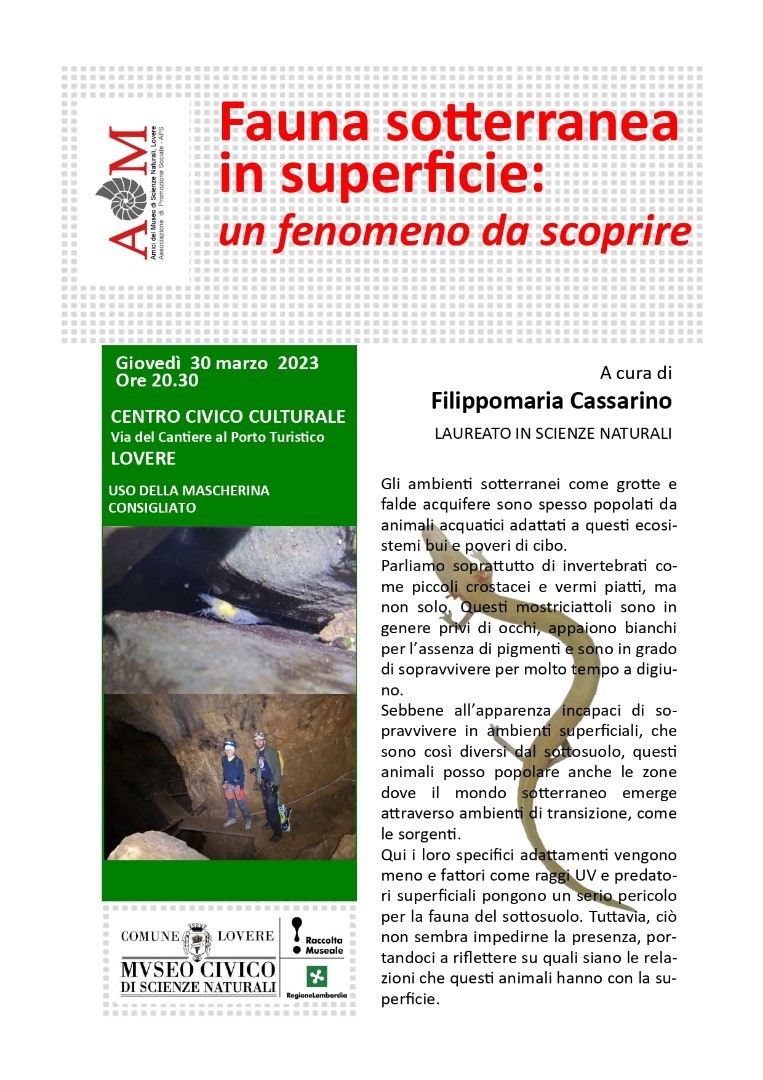 Presso il Centro Civico, si terrà la conferenza a cura di Filippomaria Cassarino, laureato in scienze naturali, dal titolo “Fauna sotterranea in superficie: un fenomeno da scoprire”.