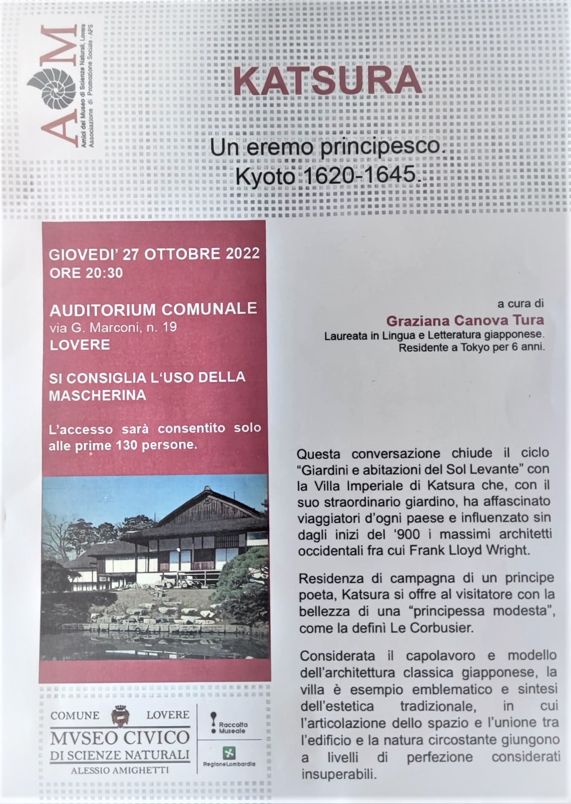 Giovedรฌ, presso lโAuditorium comunale di Villa Milesi, si terrร la conferenza "Katsura, Un eremo principesco Kyoto 1620-1645", a cura di Graziana Canova Tura, laureata in Lingua e Letteratura giapponese e residente a Tokyo per sei anni.