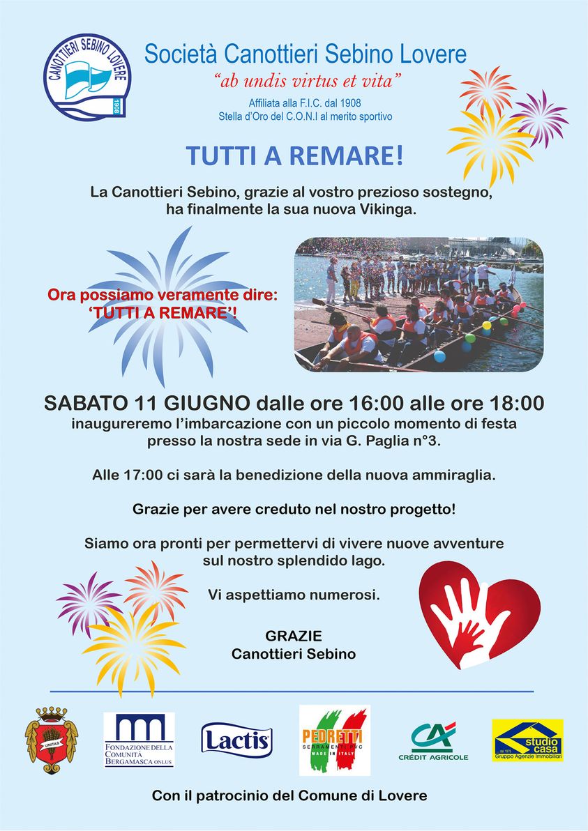 Grazie alla campagna “Tutti a remare”, una raccolta fondi promossa dalla Canottieri Sebino Lovere, sabato 11 giugno, si terrà l'inaugurazione e la benedizione della nuova imbarcazione "Vikinga".
