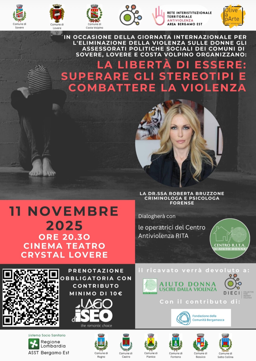 Martedì 11 novembre, il Cinema Teatro Crystal di Lovere ospiterà «La libertà di essere: superare gli stereotipi e combattere la violenza». L'evento è organizzato dai comuni di Sovere, Lovere e Costa Volpino in occasione della Giornata Internazionale per l'eliminazione della violenza sulle donne. Saranno presenti la Dottoressa Roberta Bruzzone, criminologa e psicologa forense, che dialogherà con le operatrici del centro antiviolenza RITA.