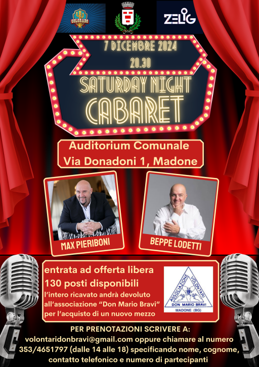 Max Pieriboni e Beppe Lodetti, maestri del cabaret, della stand up comedy e del mondo della comicità, saranno i protagonisti del Saturday night cabaret, l'evento organizzato dall'associazione volontari "Don Mario Brevi" con l'intento di raccogliere fondi per acquistare un nuovo mezzo.