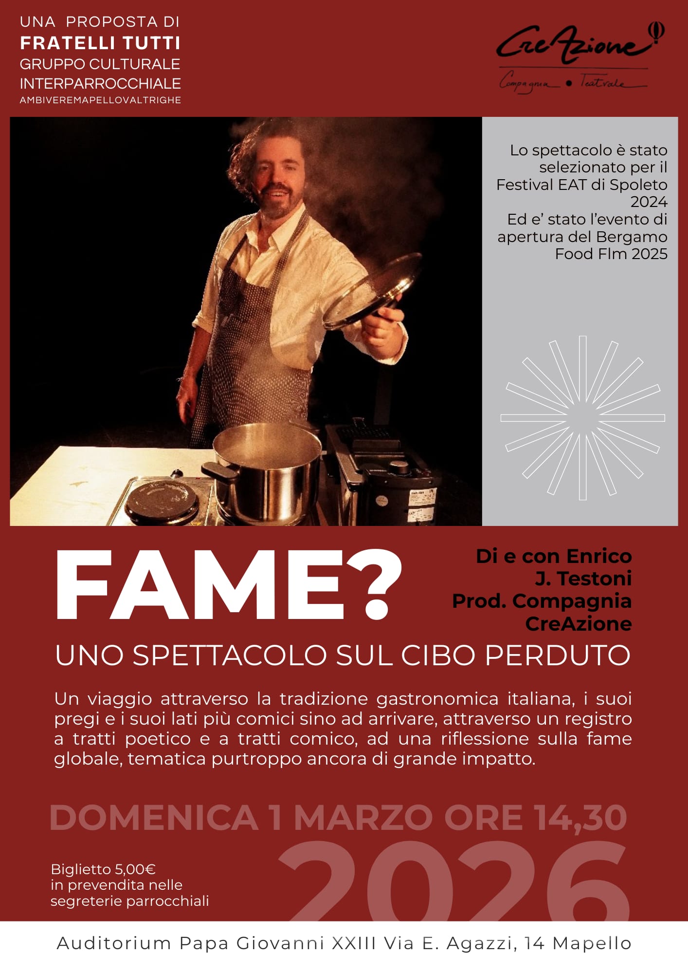 Lo spettacolo teatrale, di e con Enrico J. Testoni (Produzione Compagnia CreAzione) è stato selezionato per il Festival EAT di Spoleto 2024, oltre che evento di apertura del Bergamo Food Film Festival 2025.