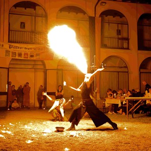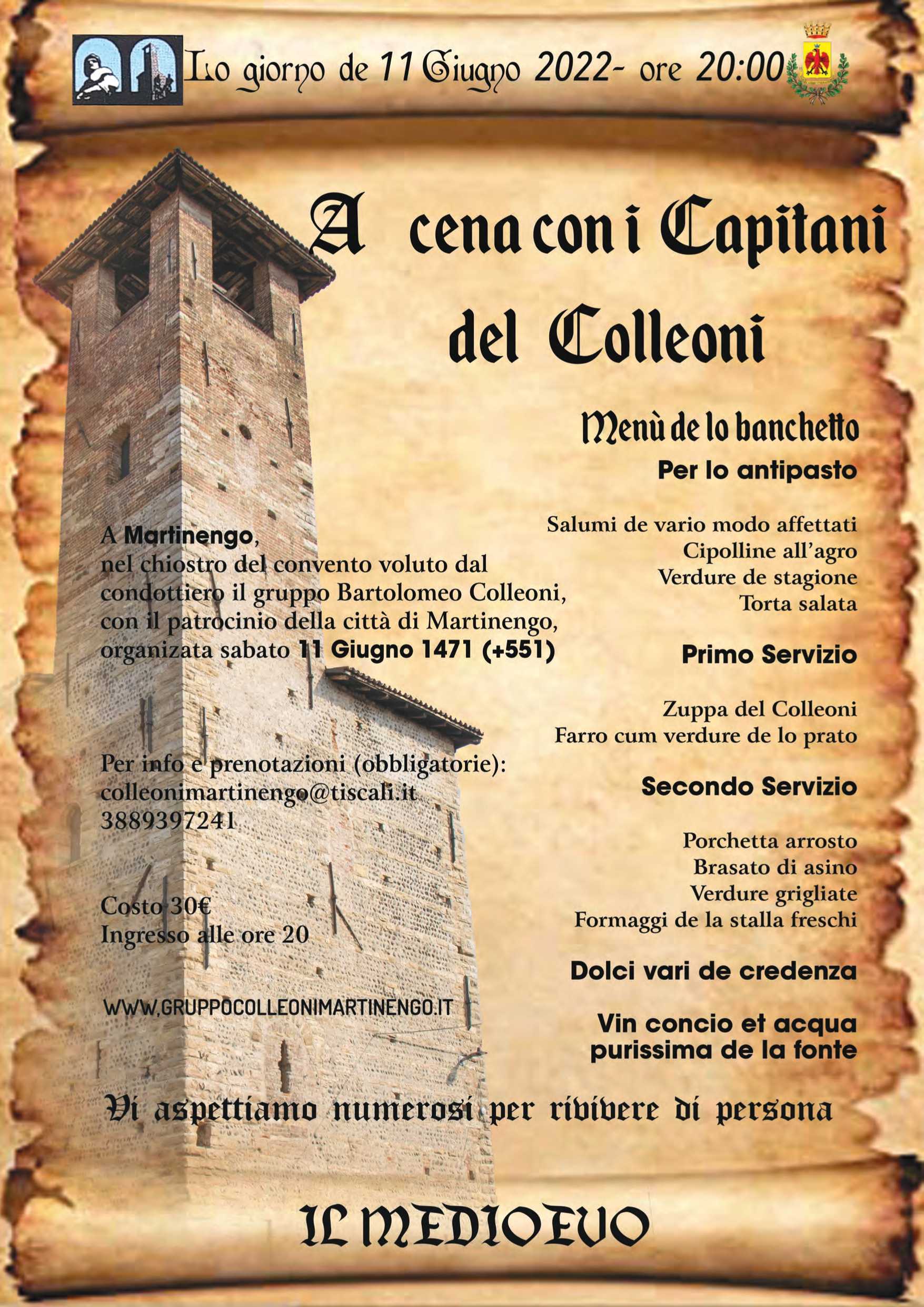 Una reale cena medievale, organizzata ricercando maniacalmente la fedeltà storica che andremo a proporre (dall'ambientazione ai cibi del menù) alla corte di Bartolomeo Colleoni e della moglie Tisbe Martinengo.