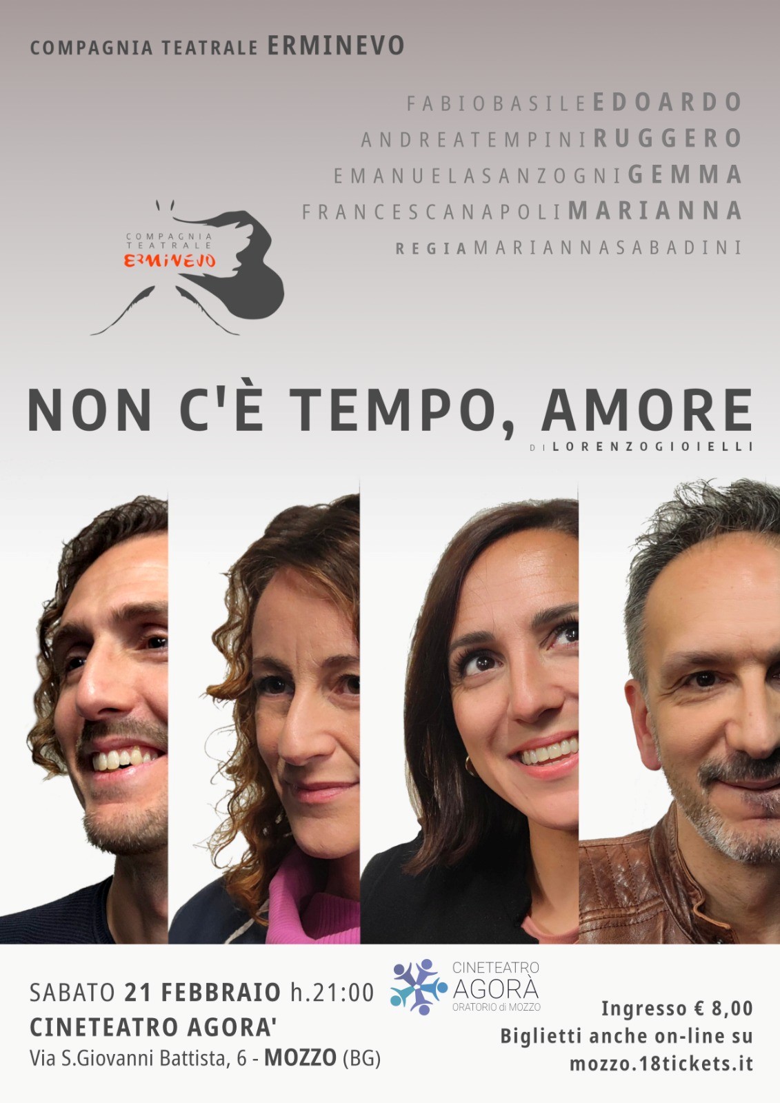 Gemma e Rudy sono una coppia vissuta che sta attraversando, ormai da tempo, una crisi: i figli sono ormai grandi e la loro assenza amplifica il loro vuoto esistenziale. Edo, amico intimo di Rudy, e Marianna, amica di Gemma, si ritrovano coinvolti non solo nelle loro liti ma anche nei loro cuori. Queste vicende tuttavia non sono il racconto banale di un matrimonio che naufraga nei tradimenti, ma un'analisi di quattro personalità che si intrecciano. Uno spettacolo intenso, dai toni falsamente leggeri. Una commedia brillante, specchio di una realtà. Quando forse davvero non c'è più tempo e spazio per riavere qualcosa di perduto. Quando dentro di noi le risposte ci sono già e le decisioni sono già state prese. O forse no? Prendetevi il TEMPO per sorridere, il TEMPO per piangere, il TEMPO per riflettere e per riconsiderare equilibri sospesi attraverso questo testo così sincero.