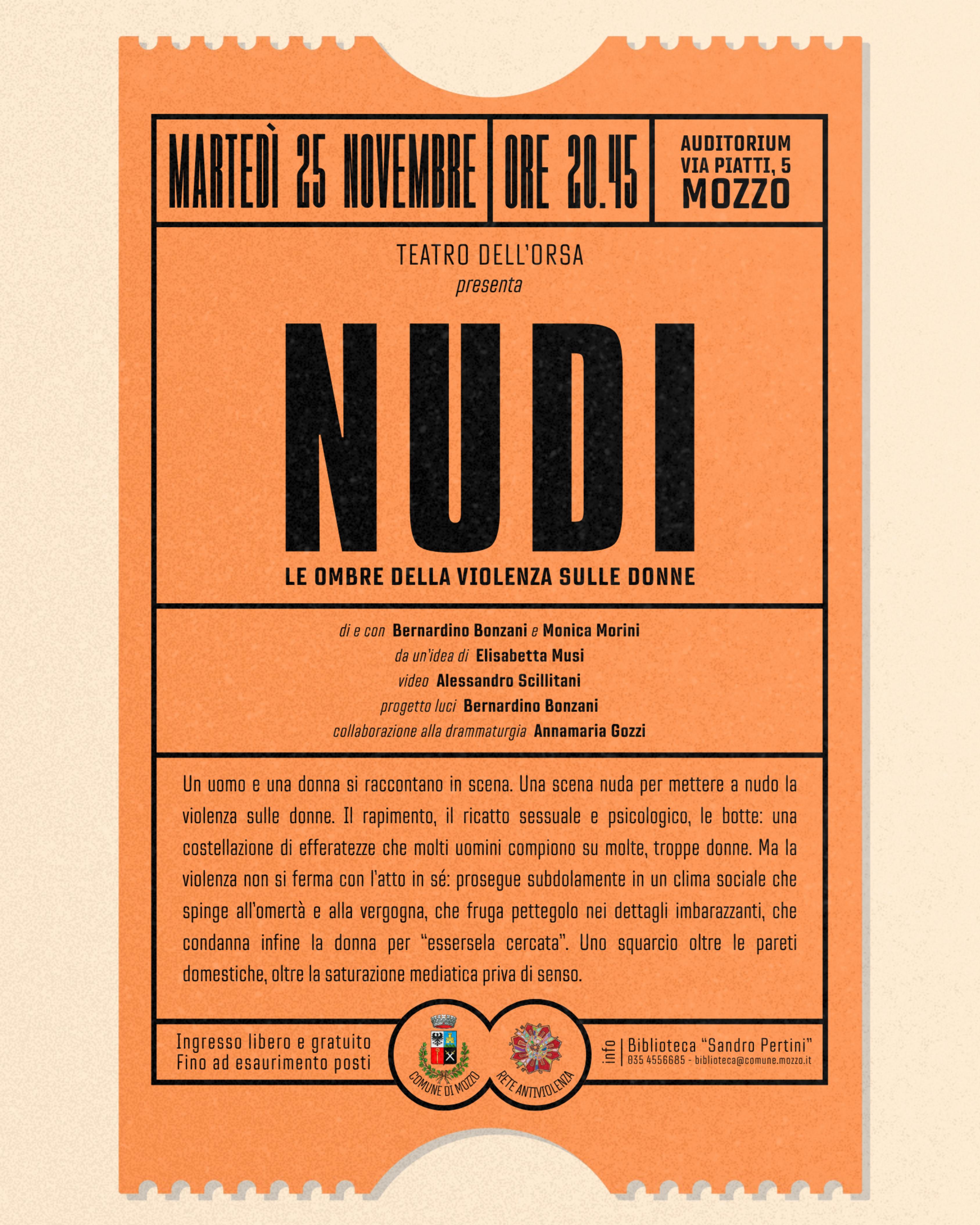 «Nudi» è il racconto in scena di un uomo e una donna. Una scena nuda per mettere a nudo la violenza sulle donne. Il rapimento, il ricatto sessuale e psicologico, le botte: una costellazione di efferatezze che molti uomini compiono su molte, troppe donne. Ma la violenza non si ferma con l’atto in sé: prosegue subdolamente in un clima sociale che spinge all’omertà e alla vergogna, che fruga pettegolo nei dettagli imbarazzanti, che condanna infine la donna per “essersela cercata”.