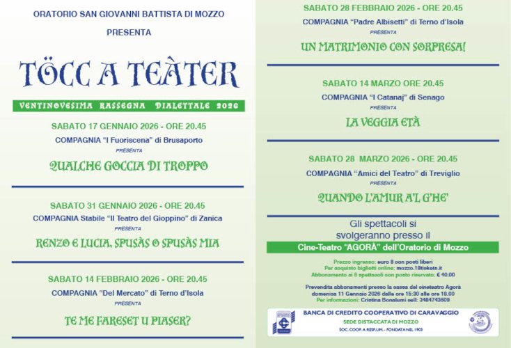 Torna la 29esima edizione della rassegna dialettale «Töcc a teàter» al CineTeatro Agorà di Mozzo, organizzata dall'Oratorio San Giovanni Battista e in ricordo del regista Vittorio Rota.