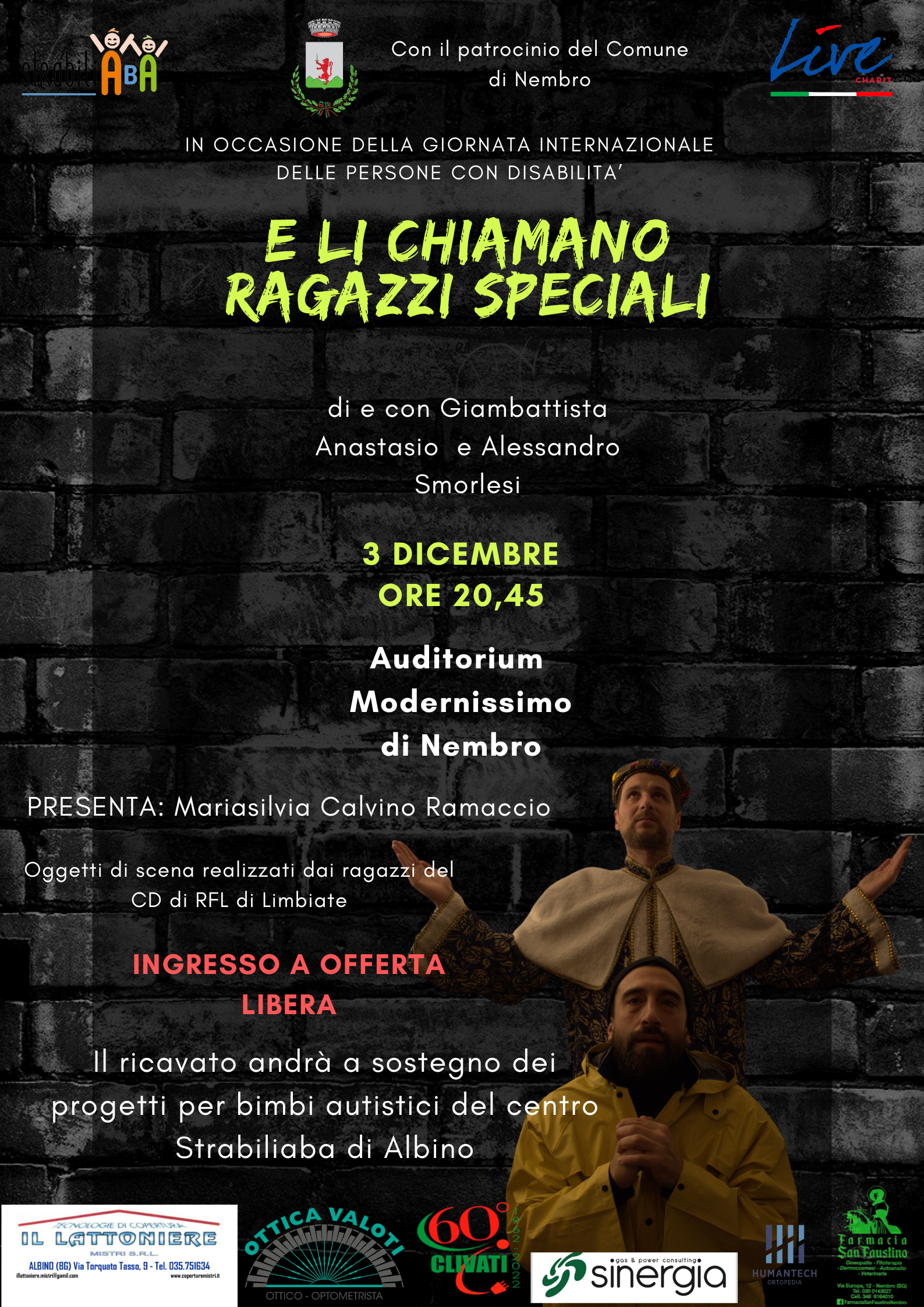 “Ragazzi speciali”: così sono comunemente chiamati i ragazzi con disabilità, in particolare intellettive o cognitive. Uno spettacolo teatrale per sensibilizzare e diffondere consapevolezza, con Giambattista Anastasio e Alessandro Smorlesi.