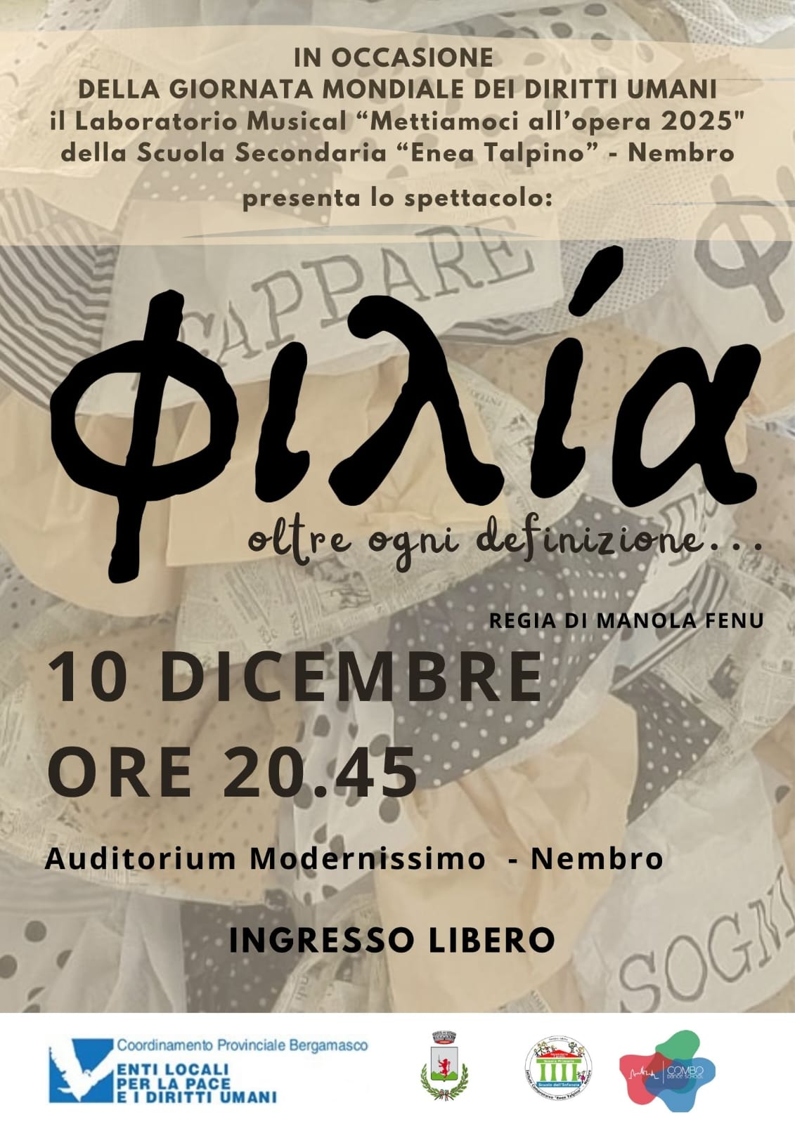 Per la Giornata mondiale dei diritti umani, il Laboratorio Musical «Mettiamo ci all'opera 2025» della Scuola Secondaria «Enea Talpino» di Nembro presenta lo spettacolo «Philia... Oltre ogni definizione».