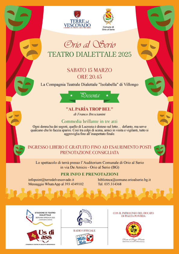 La Compagnia Teatrale Dialettale "Isolabella" di Villongo presenta la commedia brillante in tre atti "AL PARÌA TROP BEL" di Franco Brescianini. Un’incredibile storia di segreti, malintesi e risate a non finire. Ogni donna ha i suoi segreti, e quello di Lucrezia è particolarmente inquietante: un defunto steso sul letto. Ma la situazione si complica quando diventa necessario far sparire il corpo senza destare sospetti. Tra colpi di scena, visite inaspettate da amici e curiosi, e un gruppo di vigilanti ben più attenti del previsto, la trama si infittisce, portando lo spettatore verso un finale tanto imprevedibile quanto esilarante.